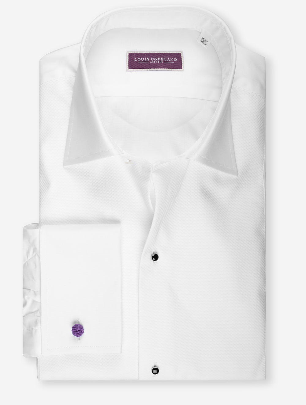 The Louis Copeland Super Slim Dress Shirt in White is the epitome of classic elegance, crafted from premium marcella cotton. This dress shirt is designed with a super slim fit to offer a sharp and modern silhouette, making it an ideal choice for black-tie events. The marcella front panel adds texture and dimension to the shirt, while the removable black studs enhance its formal appeal, perfect for weddings, galas, or any sophisticated occasion. Pair it with a tuxedo and bow tie for a timeless, refined look, or wear it with a dinner jacket for a statement ensemble. Its spread collar and double cuffs ensure that it stands out, while the English placket and hand-finished details speak to the quality craftsmanship behind the design.